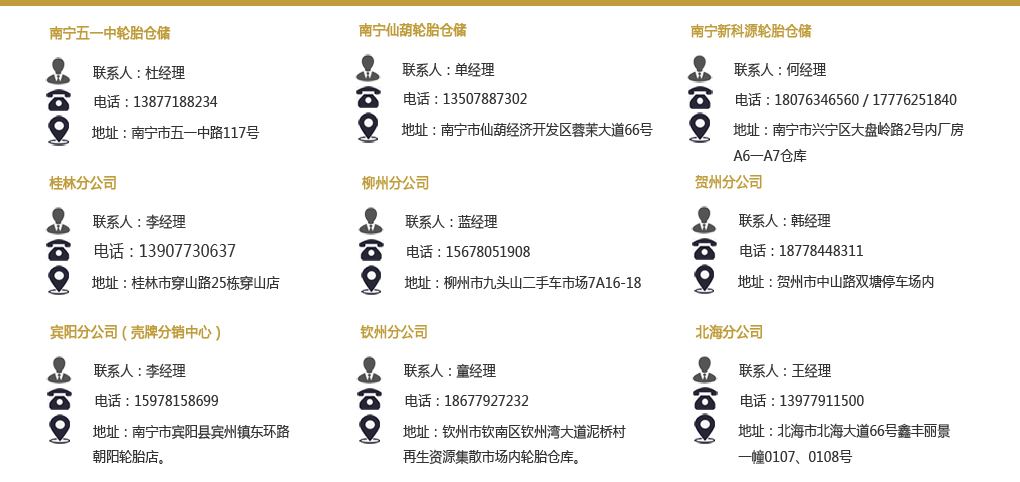 本公司是廣西區(qū)內(nèi)的輪胎批發(fā)及零售商,獨家代理世界及國內(nèi)眾多知名品牌輪胎:德國大陸馬牌輪胎(世界第四品牌),美國庫珀輪胎(世界第八品牌)杭州中策朝陽(中國第一品牌),杭州中策好運(中國第二品牌),無錫紅豆、赤兔馬、千里馬,等品牌。在廣西區(qū)內(nèi)有眾多集團客戶,主要為中國鋁業(yè)股份有限公司平果分公司、廣西晟宇通物流有限公司、南寧市平樂行物流有限公司、柳州恒達巴士股份有限公司、廣西欽州國際集裝箱碼頭有限公司、廣西盛達混凝土有限公司、火車站物流車隊、區(qū)內(nèi)部分快運車隊等的輪胎專用供應(yīng)商。多年以來,被南寧市工商局授予“誠信?維權(quán)承諾單位”、“消費者信得過單位”以及“南寧市第一次全國經(jīng)濟普查先進集體單位”。